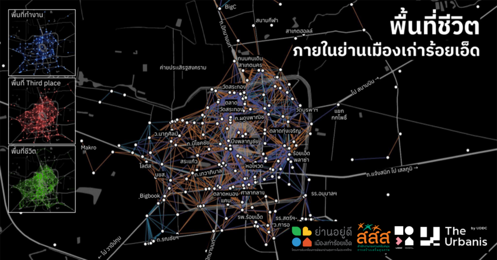 จากผลสำรวจพบว่า พื้นที่การใช้ชีวิตของชาวเมืองร้อยเอ็ดในประเภทของสถานที่ทำงานหรือโรงเรียน 5 อันดับแรก คือ โรงเรียนสตรีศึกษา โรงเรียนเทศบาลวัดสระทอง โรงเรียนร้อยเอ็ดวิทยาลัย ตลาด และวิทยาลัยอาชีวศึกษาร้อยเอ็ด ในขณะที่พืนที่ Third Place หรือพื้นที่อื่น ๆ ของชาวเมืองร้อยเอ็ด 5 อันดับแรก คือ บึงพลาญชัย Robinson หอโหวด Big-C และถนนคนเดินสาเกตนคร แสดงให้เห็นว่าพื้นที่สำหรับวิถีชีวิตนอกบ้านของชาวเมืองร้อยเอ็ดยังคงกระจุกตัวอยู่ในบริเวณคูเมืองเก่าและใจกลางเมืองเป็นหลัก แสดงถึงความท้าทายเรื่องความแออัดและปัญหาการเข้าถึงพื้นที่สุขภาวะ สำหรับชุมชนที่อยู่รอบนอก ซึ่งตอกย้ำความจำเป็นในการพัฒนาพื้นที่สุขภาวะระดับย่านและชุมชน