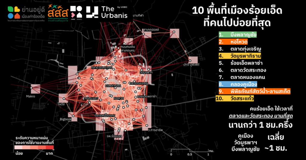 จากผลสำรวจพื้นที่ที่ชาวเมืองร้อยเอ็ดไปบ่อยที่สุด ได้แก่ 1) บึงพลาญชัย 2) หอโหวด 3) ตลาดทุ่งเจริญ 4) วัดบูรพาภิราม 5) ร้อยเอ็ดพลาซ่า 6) ตลาดวัดสระทอง 7) ตลาดหนองแคน 8) คลองคูเมือง 9) พิพิธภัณฑ์สัตว์น้ำ – ลานสเก็ต 10) วัดสระแก้ว แสดงให้เห็นว่า หอโหวดและบึงพลาญยังคงเป็นพื้นที่ศูนย์กลางเมืองที่คนนิยมไปมากที่สุด สะท้อนความเป็นแลนด์มาร์คและหมุดหมายหลักของเมืองที่ชัดเจน ในขณะที่ชาวร้อยเอ็ดใช้เวลาอยู่ที่ตลาดวัดสระทองนานที่สุด เฉลี่ยกว่า 1 ชั่วโมงครึ่ง หอโหวดและบึงพลาญ “ชัย” แสดงถึงความสำคัญของการเป็นแหล่งเศรษฐกิจที่สำคัญของเมือง
