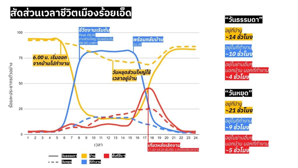 ส่วนการใช้ชีวิตในวันหยุดของชาวเมืองร้อยเอ็ด ส่วนใหญ่มักใช้เวลาอยู่ที่บ้าน บางส่วนทำงานในวันหยุดตั้งแต่เวลา 8.00 – 16.00 น. ในขณะที่พื้นที่ Third Place หรือพื้นที่อื่น ๆ นอกบ้านและนอกที่ทำงานจะคึกคักสุดในช่วงเย็น ตั้งแต่เวลา 16.00 – 18.00 น. โดยเฉลี่ยแล้ว วันหยุดชาวร้อยเอ็ดมักใช้เวลาอยู่ที่บ้านประมาณ 21 ชั่วโมง อยู่ในที่ทำงานประมาณ 9 ชั่วโมง และอยู่ในพื้นที่อื่น ๆ ประมาณ 5 ชั่วโมง